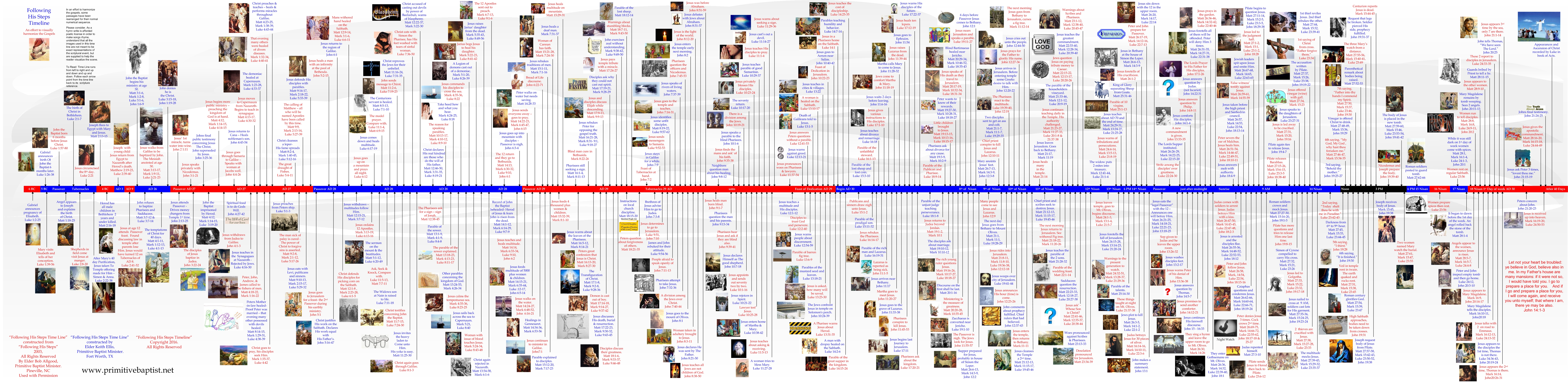 Elder Keith Ellis has produced a timeline of the Footsteps of Jesus. This printed document is over 8 feet long and 2 feet high. It highlights over 340 events, each with supporting verses from the King James Bible, documenting the ministry of our Lord. It takes an event from the earthly ministry of Jesus and shows at what point in time this event occurred and correlates these events between Matthew, Mark, Luke and John. Simple color graphics are used on many of the points to help illustrate the thought being conveyed by the scripture. We have one laminated and framed in our fellowship hall. We believe this is a great teaching aid and an excellent conversation starter. You Must See this to Appreciate it. Free to Download and Print